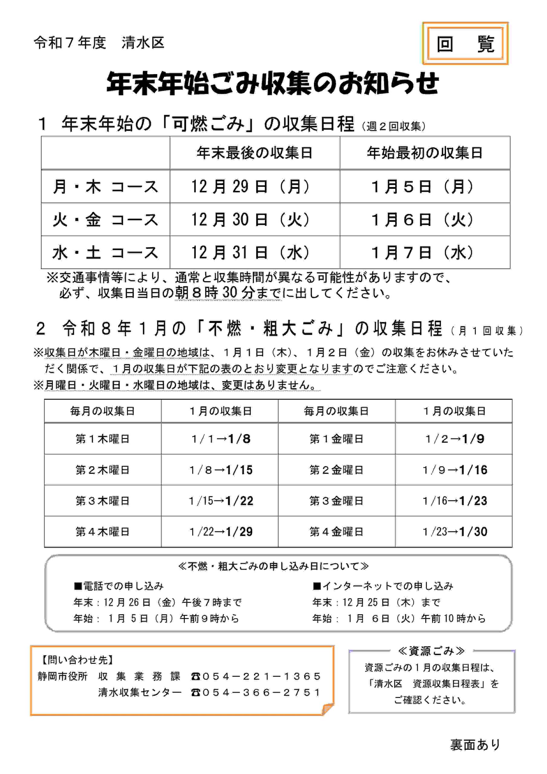 ・回覧:年末年始ごみ収集のお知らせ(清水区)